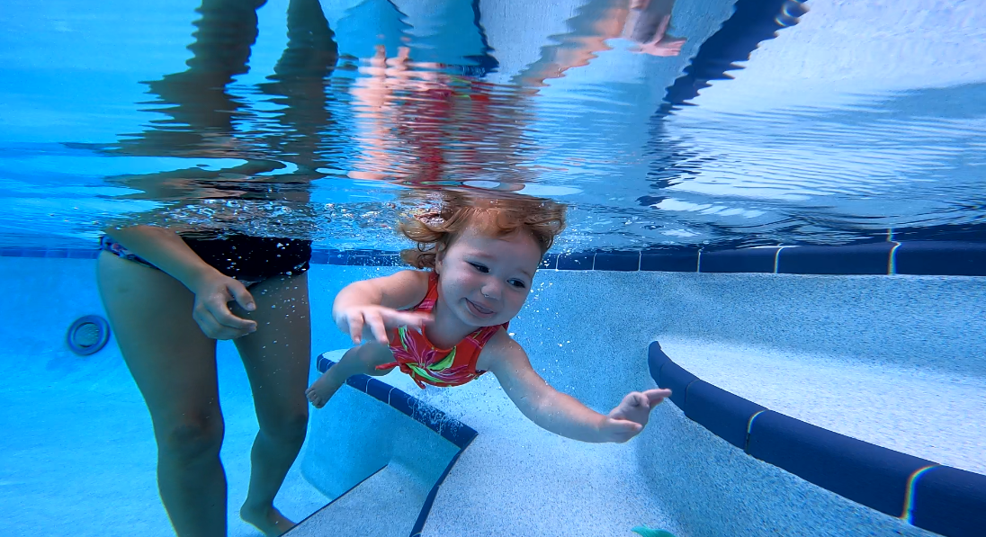 The swim-float-swim program teaches your child to swim underwater (3-4 seconds) until they need to breathe, roll to their back for a few breaths until rested, then swim starting the sequence again until they reach the pool steps, side of the pool, or the shoreline.